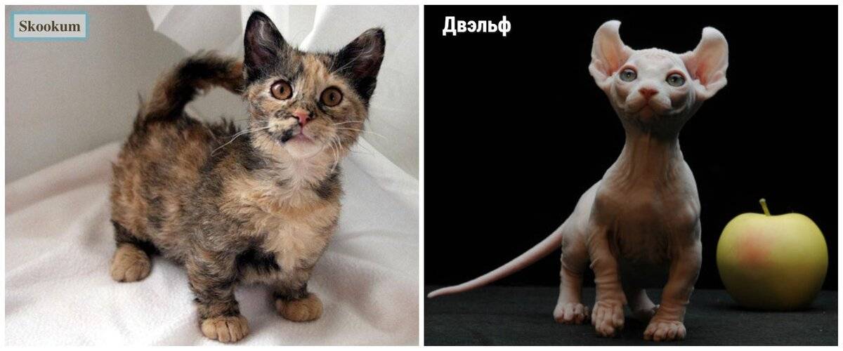 Эти претенденты на право называться самыми маленькими кошками появились в результате скрещивания сфинксов, американских керлов и манчкинов. Взрослые двэльфы весят около 1,5-3 кг. Но главной отличительной чертой необычных маленьких кошек являются большие, загнутые назад уши.