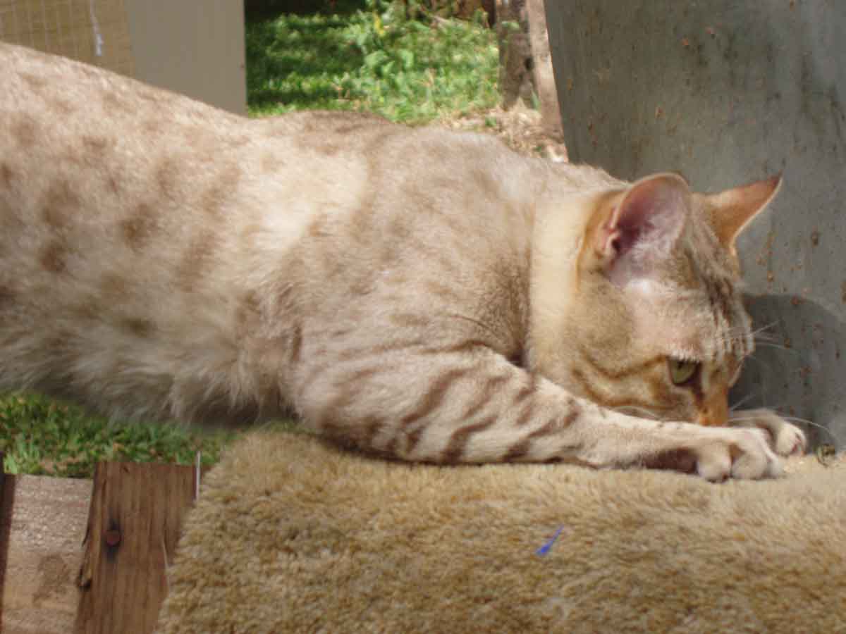 При отборе котят обращают внимание на шерсть, основной оттенок которой должен быть очень насыщенного теплого цвета, пятна темные, слегка размытые, но хорошо заметные. Голова треугольной формы, уши широко расставлены, развиты, цвет глаз в зеленой гамме