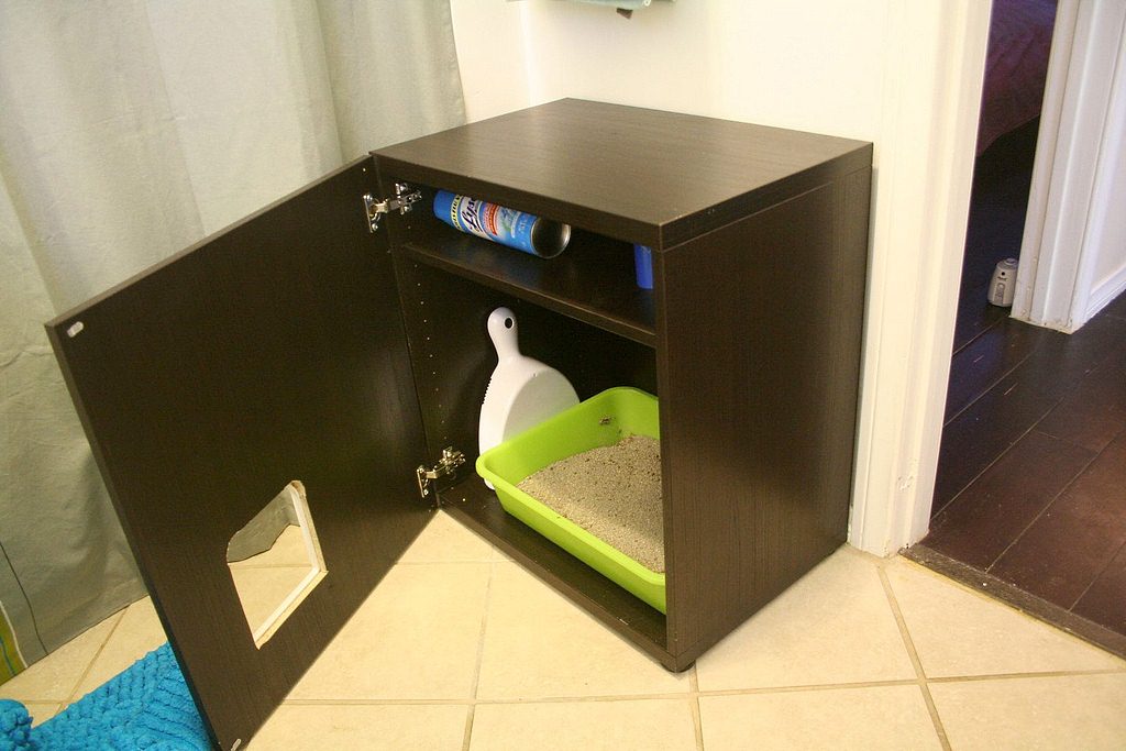 Лоток можно спрятать в тумбе в прихожей или в домике. Надо обработать внутреннюю поверхность специальным средством или обшить изнутри материалом с водоотталкивающим свойством, а в дверце сделать отверстие для входа. Домик можно купить в зоомагазине или сделать своими руками. Сначала рекомендуется изготовить макет из картона, чтобы определить размер укрытия и понять, нравится ли вообще животному закрытый туалет, и только потом решать вопрос о выборе постоянной конструкции.