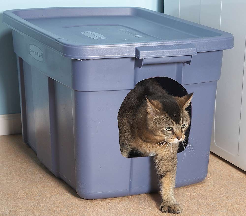 Для изготовления закрытого туалета с минимальными финансовыми и временными затратами можно взять пластиковый коробок с крышкой, проделать в одной из его стенок отверстие, через которое животное должно без труда проходить. Края прохода также нужно обработать напильником. Выбирая емкость, нужно проверить, сможет ли питомец свободно сидеть и разворачиваться в ней.