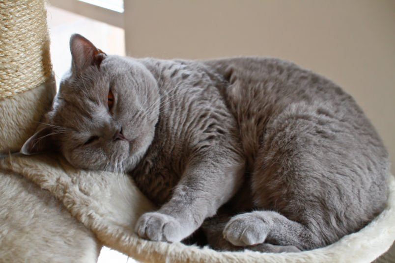 Умиротворённый, спокойный питомец уютно сворачивается в клубок, отдыхает. Ему комфортно, он не чувствует никакой опасности. О спокойствии говорит и расслабленная поза на боку с вытянутыми лапками.