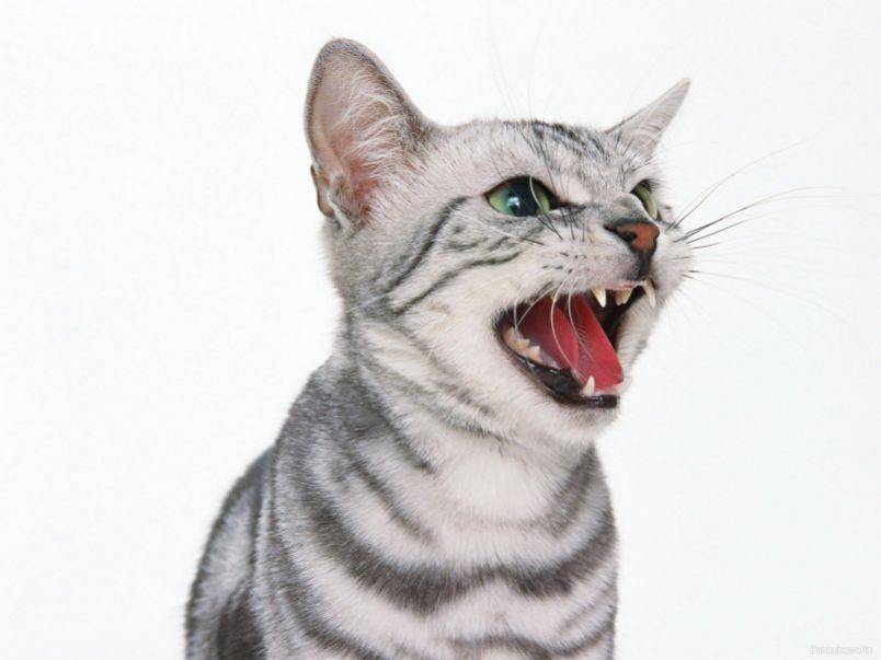 В спокойном состоянии мордочка кошки круглая и умиротворенная. В этом случае мимика кошек подчеркивает спокойствие животного даже в мельчайших деталях: уши смотрят вверх, глаза широко открыты (но зрачок имеет нормальную величину), усы и вибриссы направлены вверх. Обеспокоенная кошка выглядит очень напряженной. Мимика в этом случае легко выдает взволнованность: уши прижаты к голове, глаза сильно прищурены, а зрачок сужен. Еще ярче проявляется испуг: уши прижимаются к голове очень сильно, иногда их даже почти не заметно, голова кошки втянута в плечи, а сама она как бы собирается в комок. Что касается непосредственно мимики, то в этом случае характерной особенностью является приподнятие верхней губы и появление оскаленных клыков – за это отвечает нервное напряжение мышц, которые и приподнимают губу вверх.