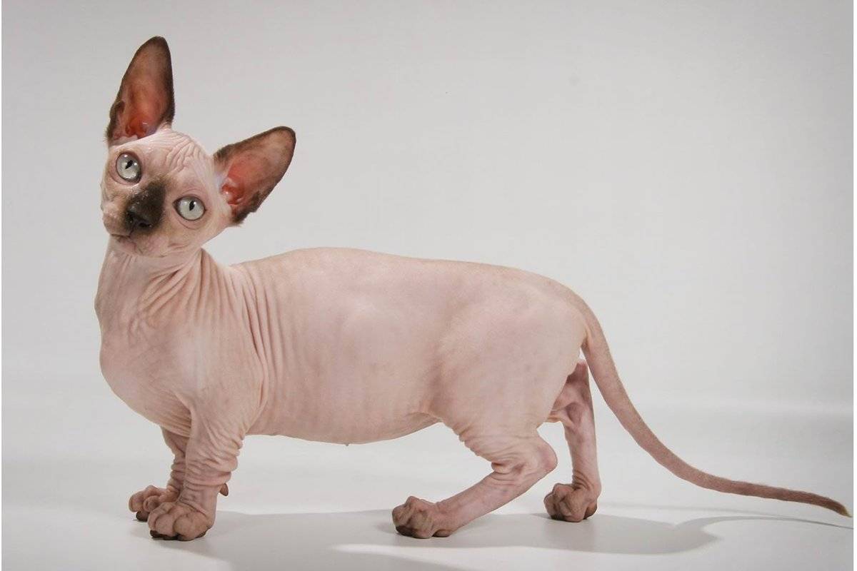 Образ животного отличается выраженной уникальностью. Пожалуй, ее не спутаешь ни с какой-нибудь другой породой. Шерсть полностью отсутствует, а тело вытянутой удлиненной стать. За это ее часто сравнивают с таксой. Что касается лап, ведь короткая у них только нижняя часть. То, что находится сверх колена, имеет вполне адекватные пропорции. Ген коротких лап обладает рецессивностью. Ввиду этого в одном и том же помете можно встретить кошек с нормальной длиной лап.