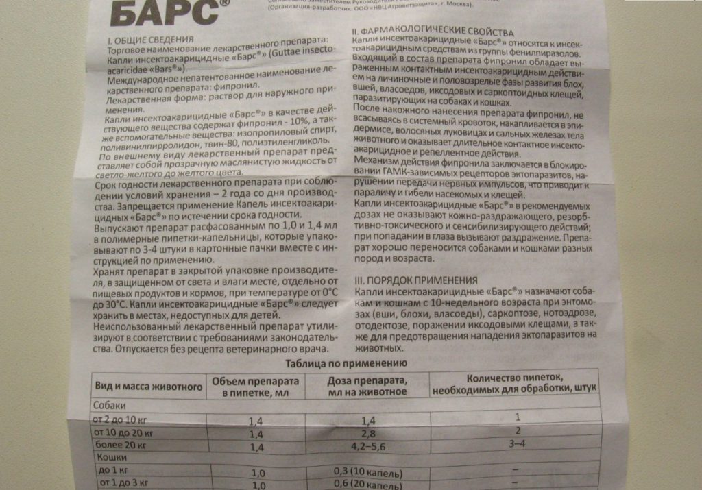 Кроме этого, использовать «Барс» нельзя, если на кожных покровах имеются повреждения. Также не стоит применять препарат во время инфекционных заболеваний или обострения хронических недугов. Под запретом препарат и для продуктивных животных.
