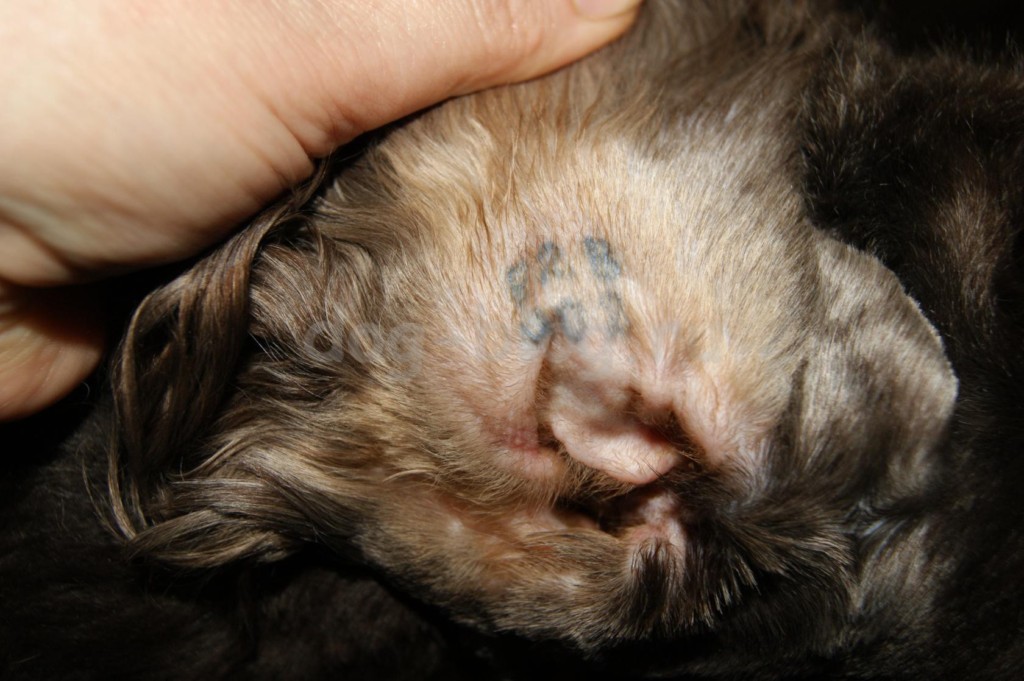 И хотя татуировку нашему щенку делала руководитель кинологического клуба лично, клеймо не только совершенно не читается, но выглядит очень не эстетично (как будто собаку покусали блохи).
