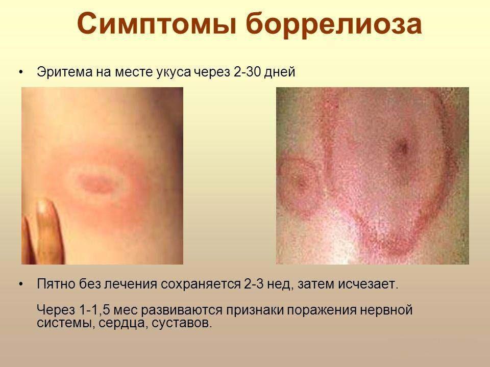 Симптомами болезни Лайма выступают гриппоподобные признаки интоксикации – увеличение температуры, слабость, боли в голове и мускулатуре. Стадия начинает проявляться по прошествии недели после инфицирования, длится около месяца. Если этот этап не заканчивается выздоровлением, то боррелиоз становится хроническим.