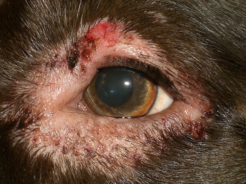 Изменение глазного яблока и век. Помутнение, возникновение изъязвлений и деформация, а также покраснение и отёчность, сопровождающиеся сужением щели между веками, свидетельствуют о развитии недуга.