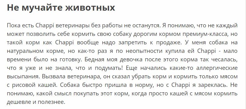 «Я давно работаю ветеринаром и часто принимаю собак, отравившихся кормом. Но те, кто питается едой марки Чаппи, ни разу не приходили ко мне на прием с расстройствами желудка. Это говорит о том, что, несмотря на невысокую стоимость питания, оно отличается хорошим качеством и сбалансированным составом».