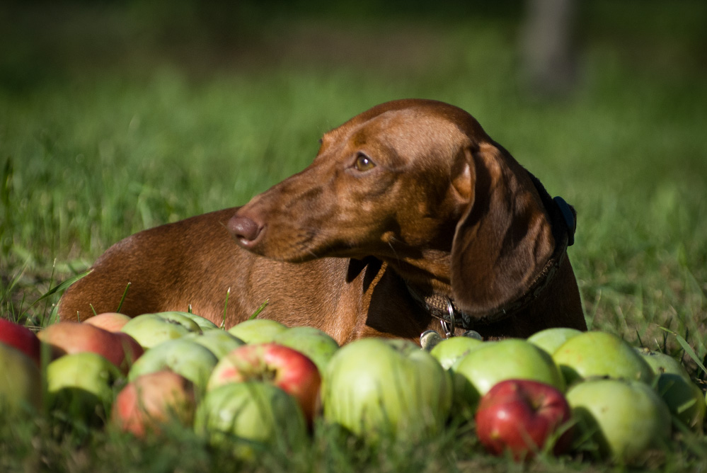 Такса лежит рядом с яблоками