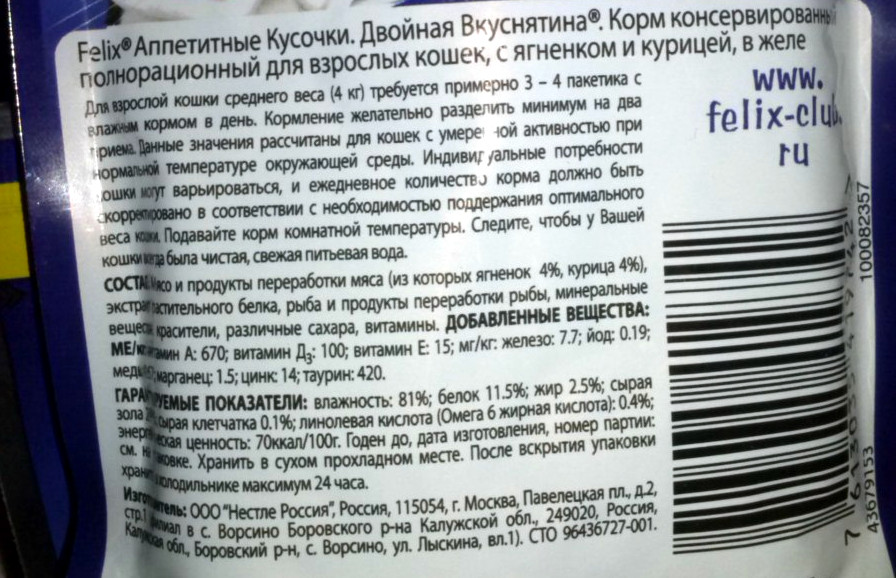 Интересно то, что текстом указано «Изготовитель: «Mars GmbH», Германия», а на штрих коде код 460, обозначающий Россию. Так где же произведен корм? Штрих код должен содержать достоверные данные, значит корм или произведен, или упакован в России.