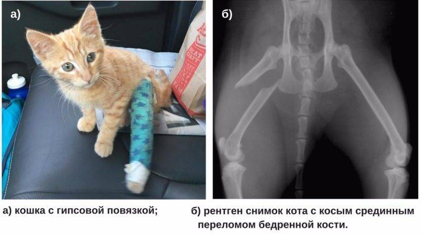 В качестве первой помощи конечность необходимо обездвижить, наложив шину из картона и зафиксировав повязкой. Стараясь не тревожить больную лапу, нужно доставить кошку в ветеринарную клинику. После рентгена и детального осмотра специалисты в зависимости от серьёзности травмы наложат гипсовую повязку или лангетку.