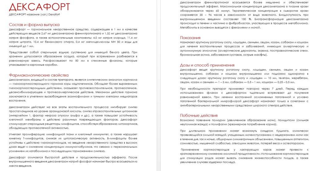 СОСТАВ И ФОРМА ВЫПУСКАПрепарат представляет собой прозрачную бесцветную или слегка желтоватую жидкость. В 1,0 см³ препарата содержится 0,004 г дексаметазона фосфата, вспомогательных веществ и растворителя до 1,0 см³.Препарат выпускают в герметично укупоренных стеклянных или пластиковых флаконах по 10,0; 20,0; 50,0 и 100,0 см³.ФАРМАКОЛОГИЧЕСКИЕ СВОЙСТВАДексаметазона фосфат представляет собой фторированный аналог гидрокортизона, более активен, чем преднизолон и кортизон. Обладает выраженным противовоспалительным, антиаллергическим, противоотечным и глюконеогенетическим действием.Препарат блокирует высвобождение эозинофилами медиаторов воспаления, в том числе простагландинов, которые участвуют в развитии воспалительного процесса. Стимулирует стероидные рецепторы лимфоцитов, способствуя биосинтезу липокортинов, обладающих противоотечной активностью; угнетает пролиферацию лимфоидной ткани и клеточный иммунитет, а также нарушает хемотаксис Т-лимфоцитов, снижая их цитотоксическую активность.Максимальная концентрация дексаметазона в крови обнаруживается через 60 минут. Терапевтическая концентрация в сыворотке крови сохраняется в течение 30-96 часов в зависимости от вида животного. Биодоступность при внутримышечном введении составляет 100%. Биотрансформация происходит в печени и частично в фибробластах, участвующих в процессе метаболизма. Метаболиты, в основном, выводятся через печень и почки.ПОКАЗАНИЯПрепарат применяют животным при нарушении обмена веществ (кетоз и токсемия после родов у овцематок и свиноматок); воспалительных процессах, особенно опорно-двигательного аппарата (артриты, периартриты, тендовагиниты, бурситы, вывихи, миозиты, растяжения связок); острых инфекционных заболеваниях (в комбинации с антимикробными средствами); аллергических состояниях (атопический и контактный дерматиты, крапивница, зуд, конъюнктивит); ламинитах у лошадей и крупного рогатого скота; при укусах змей и насекомых; стрессовых (выставки, тренировки) и шоковых состояниях.ДОЗЫ И СПОСОБ ПРИМЕНЕНИЯПрепарат вводят внутримышечно, желательно в первой половине дня: лошадям и крупному рогатому скоту – 5 см³; свиньям – 2-3 см³; поросятам, собакам – 0,5-1 см³; кошкам-0,25-0,5 см³ один раз в день в течение трех суток. При необходимости курс лечения следует продолжить.В случае инфекционных заболеваний препарат применяют только в комплексе с антимикробными препаратами.ПОБОЧНЫЕ ДЕЙСТВИЯПри длительном применении возможно появление синдрома Кушинга, что вызывает перераспределение жира в организме, мышечную слабость, потерю веса и остеопороз. Возможно появление полиурии, полидипсии и полифагии. Применение кортикостероидов у лактирующих коров может вызвать кратковременное снижение молочной продуктивности. В случае скрытых инфекций препарат может вызвать их обострение.ПРОТИВОПОКАЗАНИЯПрепарат не применяют во время последнего триместра беременности, при сахарном диабете, переломах костей, при вирусных и грибковых инфекциях.ОСОБЫЕ УКАЗАНИЯУбой крупного рогатого скота и свиней на мясо разрешается не ранее чем через 48 дней, лошадей – через 24 дня. Молоко коров можно использовать в пищу через 5 суток. В случае вынужденного убоя до истечения срока ожидания мясо животных может быть использовано на корм плотоядным животным.Меры личной профилактикиПри р