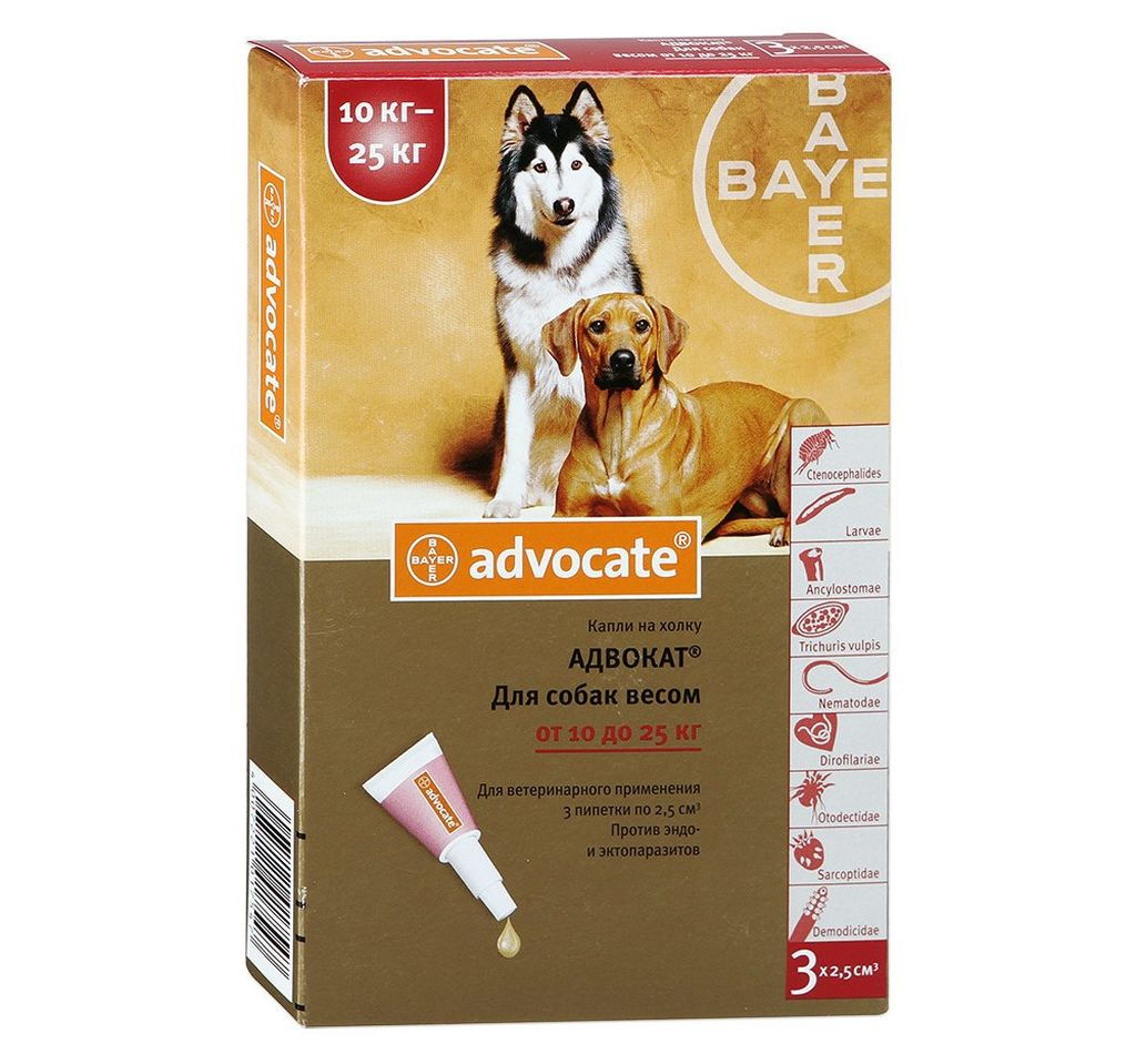Препарат производится международной компанией с экспертизой в области здравоохранения и сельского хозяйства – Bayer (Германия). Адвокат действует на личинок сердечного глиста, останавливая их развитие во взрослого паразита.