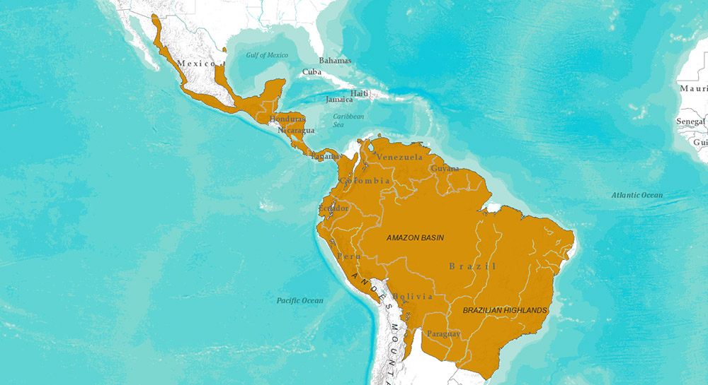 Впервые хищное млекопитающее удалось заметить принцу Максимилиану Вид-Нойвиду, который собирал в Бразилии экземпляры животных. В настоящий момент этих кошек можно встретить на территории густых, влажных и вечнозеленых лесов Центральной и Южной Америки. Они распространены на Кубе, в Белизе, Эквадоре, Панаме, Уругвае, Бразилии, Гайане, Перу, северной Колумбии, восточной и северной части Парагвая, а также в северной Аргентине.