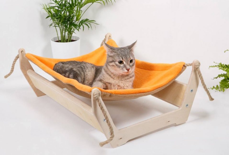 - Домик-гамак. Любой кошке интересны новые места. Сделать гамак для ее отдыха очень просто. Для этого можно воспользоваться: маленьким журнальным столиком, креслом или стулом. Но эти предметы мебели должны иметь 4 ножки. Так, на уровне между полом и столешницей/сиденьем натягивается полотно. По его бокам должны быть пришиты по две тканевые ленты к каждой. Затем полотно крепится к ножкам посредством завязок. И вуа-ля!