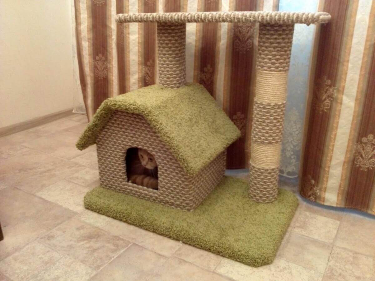 Часто домик для кошки совмещают с когтеточкой. Это удачное решение. Для этого лучше всего подойдёт пластиковая канализационная труба и джутовая веревка. Если вы используете деревянный брус или доску, то их тоже необходимо обмотать, иначе кошка может занозить лапы.