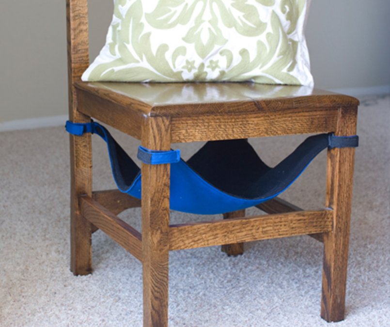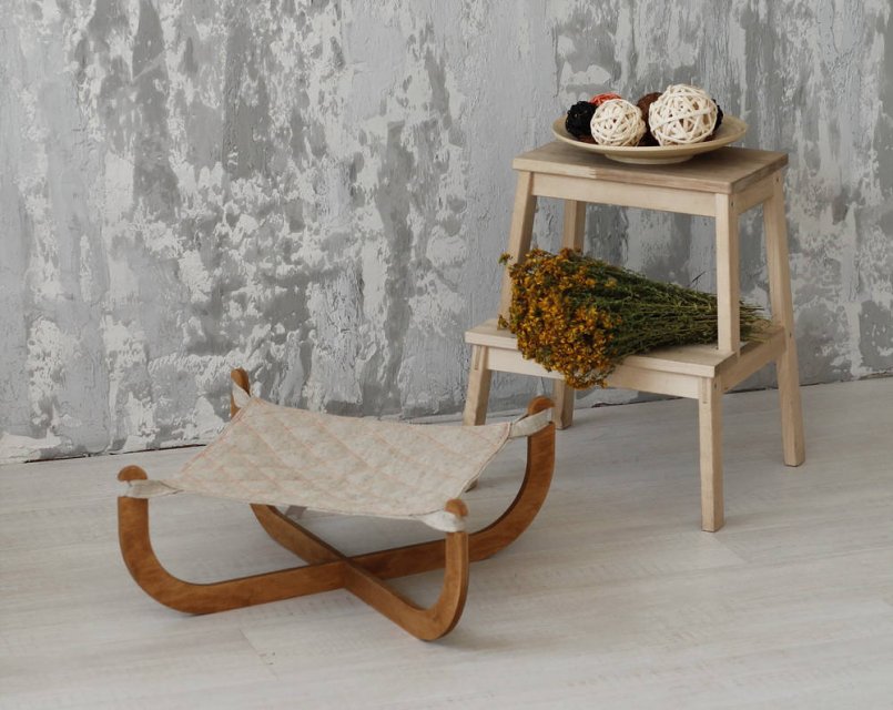 Чехол сшивается из двух кусков ткани. Подвесные детали каркаса оберните тканью или шпагатом. Если тканевое дно лежака будет чуть провисать, ничего страшного – если по форме его кровать будет напоминать гамак, животное будет этому только радо.