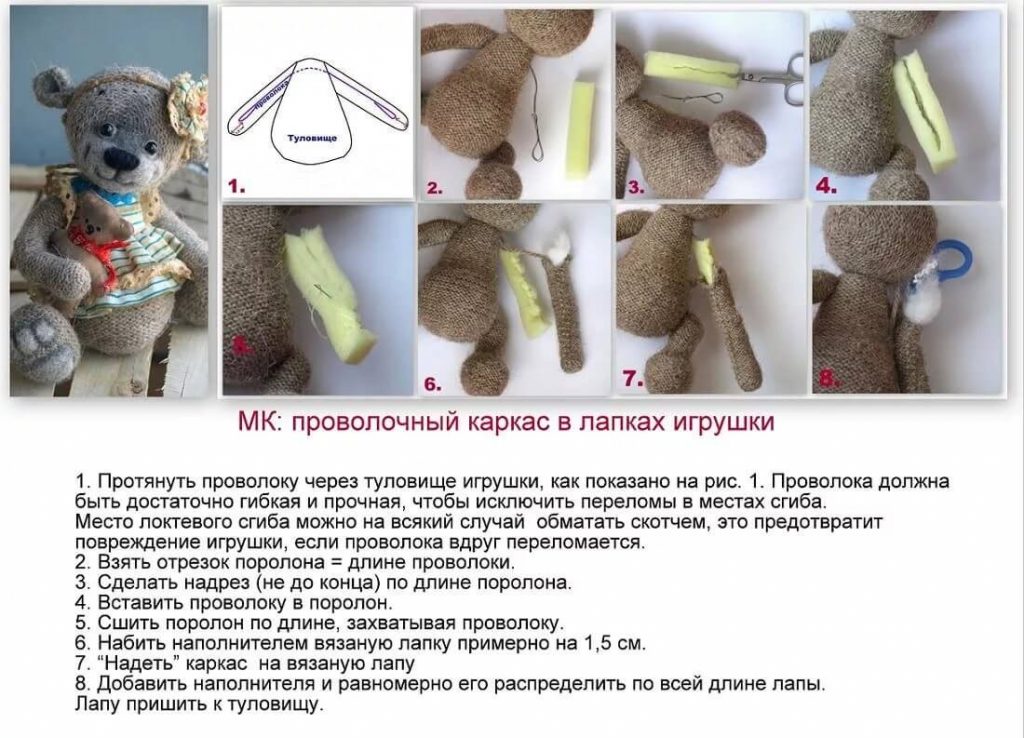 Это может быть двойной шплинт, как на картинке. Здесь соединение не только головы, но и лап. Для головы: возьмём один металлический шплинт и вставим его в другой такой же. Такой вариант крепления нужен для того, чтобы голова качалась и была подвижна.