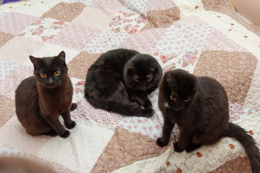 Одни питомцы с опаской смотрели из дальних комнат,другие,находившиеся ближе,изучающе разглядывали нас со своих «смотровых площадок». Те,кто посмелее,успели подойти и начали тереться о ногу,громко мурча.