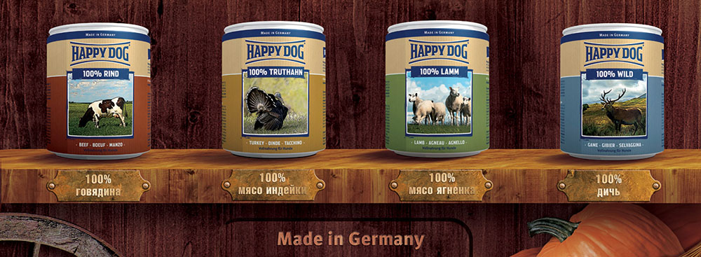 HappyDog (Хэппи Дог). Третье место занимают немецкие консервы, производителем которых является уважаемая компания Interquell. Минус корма в сравнении с предыдущим рационом Беркли в более низком содержании протеина и жиров. В Беркли содержится около 10% протеина и 7% жиров, а в Хэппи Дог эти показатели достигают 7,5 и 4,5%. В составе консервов также нет места искусственным красителям, консервантам и сои, а основу корма составляет мясо, растительное масло, витамины и минералы.