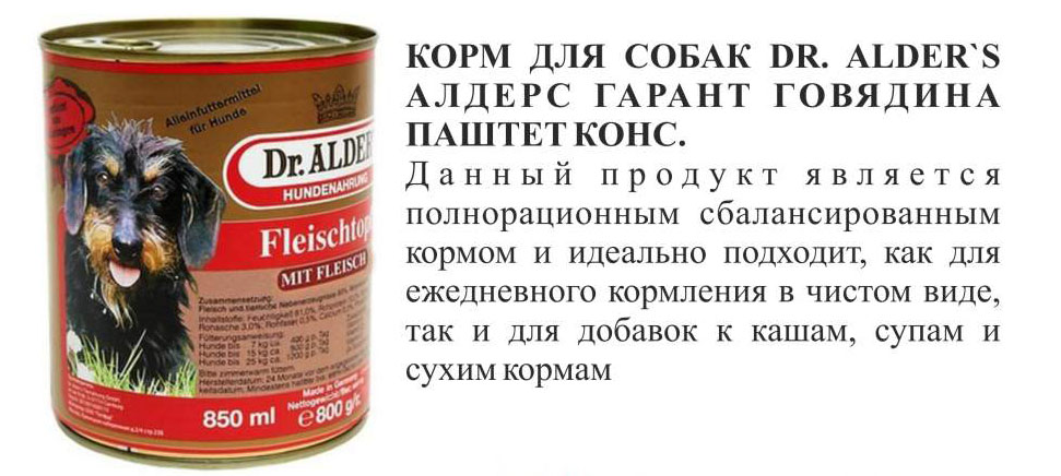 Alder`s (ДокторАлдерс). Эти консервы немецкого производства признаны лучшим влажным кормом в категории премиум и занимают почетное перовое место. При производстве питания используются только свежие природные продукты, которые поставляются с окрестных территорий. Состав корма содержит мясной компонент без наполнителей, при отсутствии консервирующих средств, красителей, ароматизаторов и вкусовых добавок. Процент мяса и животных продуктов составляет 80%. Также в рецептуру корма включены растительные масла, витамины и минеральные вещества. Консервы могут использоваться в качестве полнорационного сбалансированного питания для ежедневного кормления питомца.