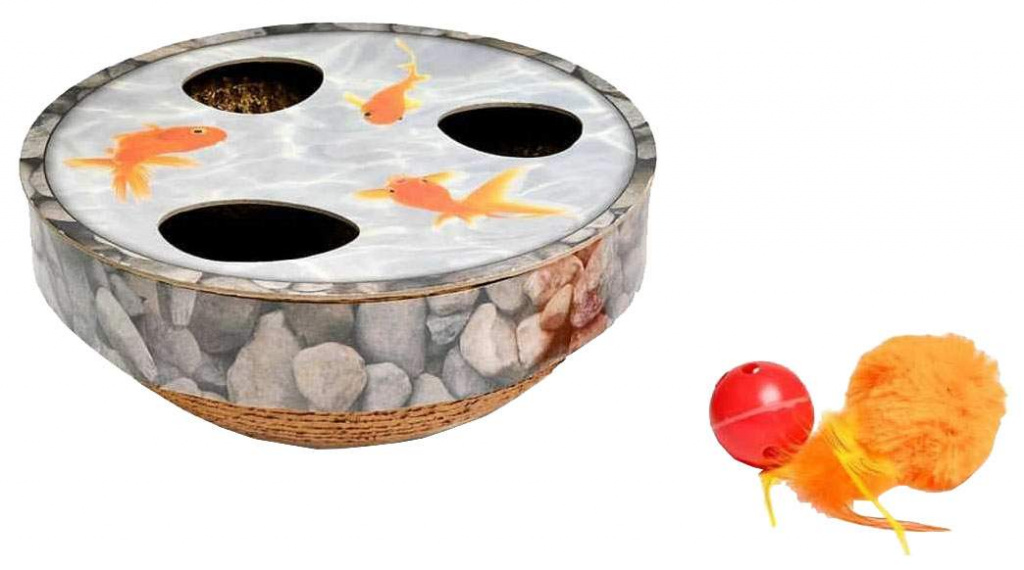 В отличие от других участников обзора, игрушка Hide&Seek Воблер включает в себя сразу 3 изделия. Это интерактивный трек, картонная когтеточка с мятой, звенящий мячик и пушистик с перышком. Воблер представляет собой неваляшку, которая перекатывается в разные стороны. Его аромат привлекает кошек. Питомцы довольно быстро вынимают из комплекта текстильный мячик.