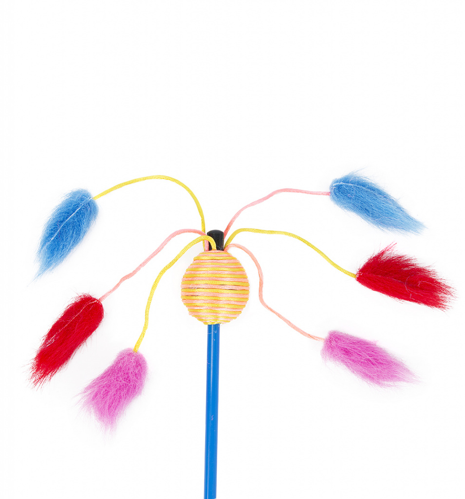 Открывает категорию незамысловатая игрушка, которая представляет собой пластмассовую палочку с шариком и помпонами из меха. Она приводит любого котенка в восторг. Играя с палочкой, питомец показывает свой хищный нрав, выплескивает адреналин и развивается физически.