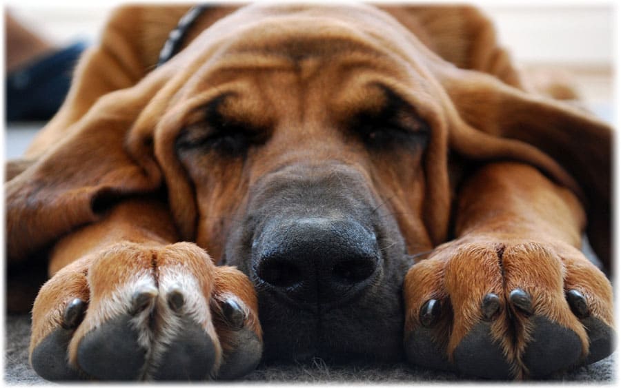 На фото бладхаунд демонстрирует свои лапы для охоты
