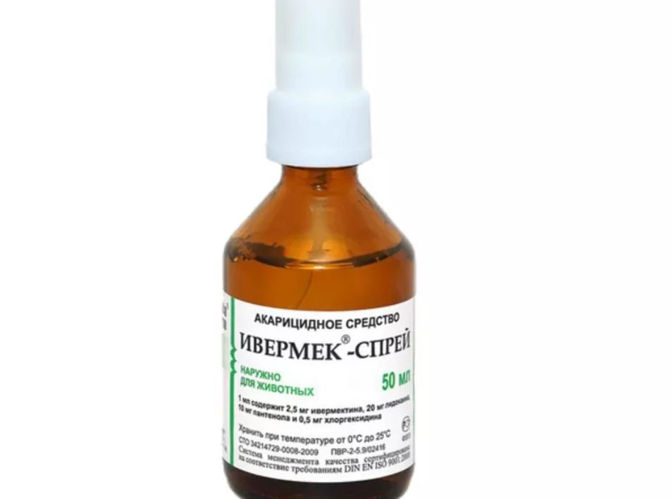 Спрей. Такая форма лекарства хорошо подходит для обработки животных. Поражённые места опрыскиваются на расстоянии 20 см. Без необходимости данный препарат лучше не использовать. Повторная процедура проводится через 21 день.