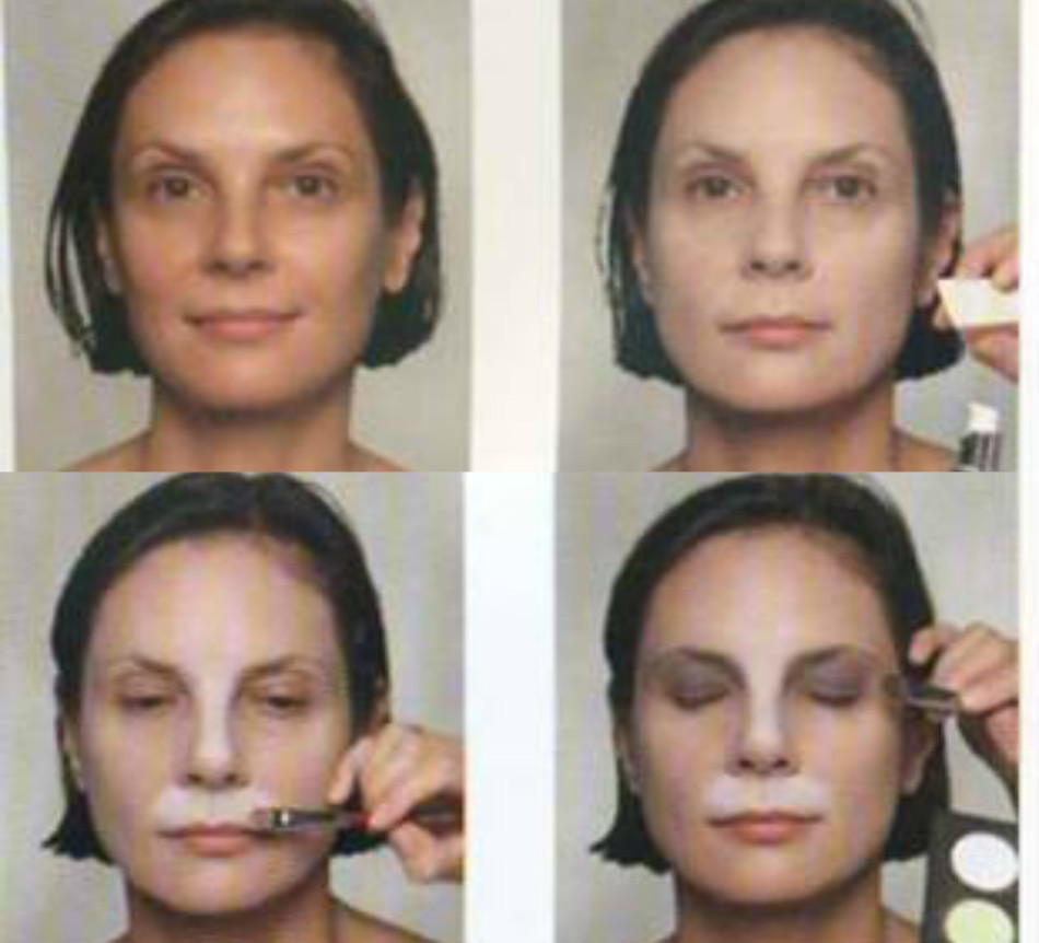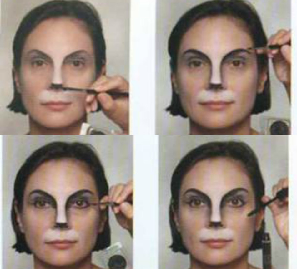 - С помощь тех же белых теней, серых или бежевых, нанесенных более плотным слоем, выделяют носогубной треугольник, нос и участок лба между бровей.