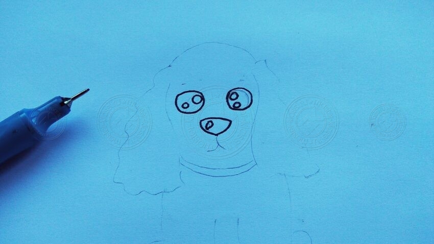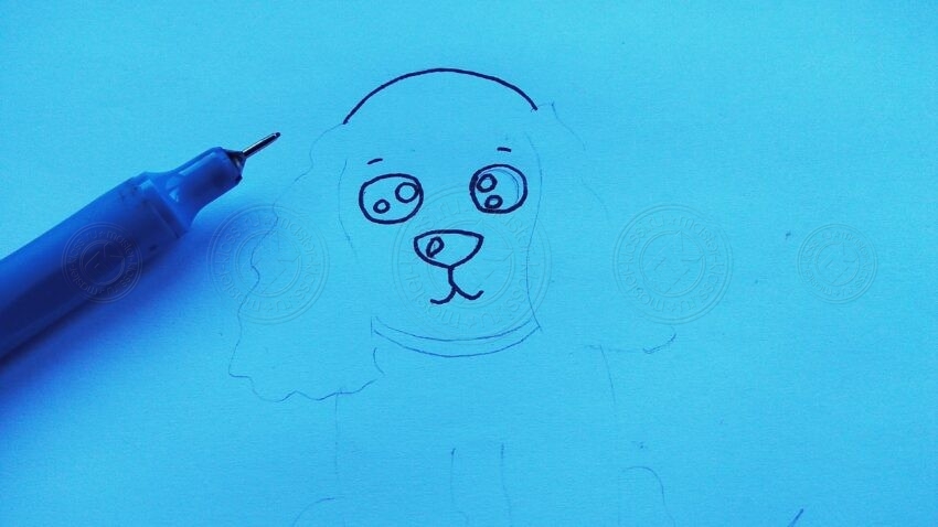 Нарисованный небольшой круг тоже делится вертикальной линией пополам. По середине его будет располагаться носик песика.