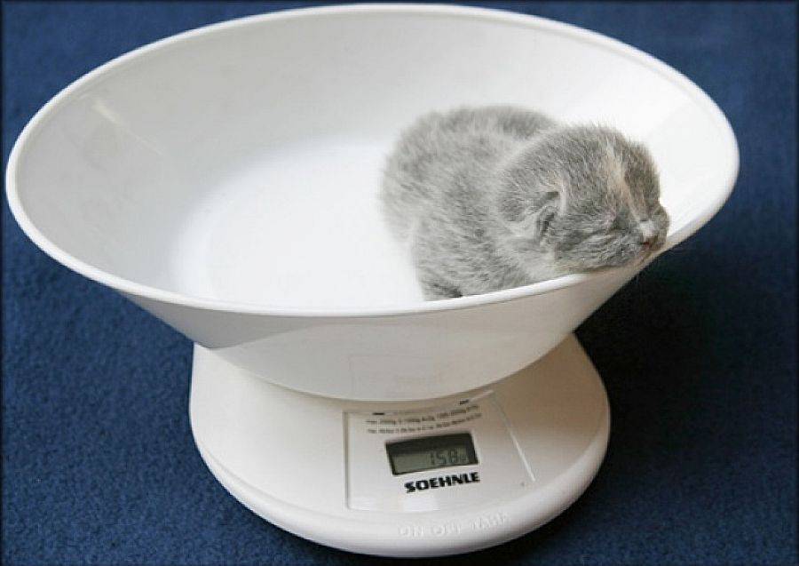 Котёнка можно взвесить, но эта цифра не даст точной информации о возрасте малыша. Здесь большую роль играют порода и наследственность. Разница может быть существенной и не очень, многое зависит от индивидуальных особенностей развития. При рождении котята имеют рост 10-12 см (без хвоста), весят около 100 г и ежедневно прибавляют в весе до 10-20 г. После 3-месячного возраста прибавка в весе варьируется от 350-400 г до 500 г ежемесячно.