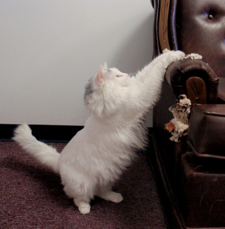 - если кот царапает мебель, на которой обычно сидит хозяин, это может быть проявлением симпатии или стремления быть поближе к человеку (в этом случае зачастую достаточно установить когтеточку поближе к любимому креслу или дивану).