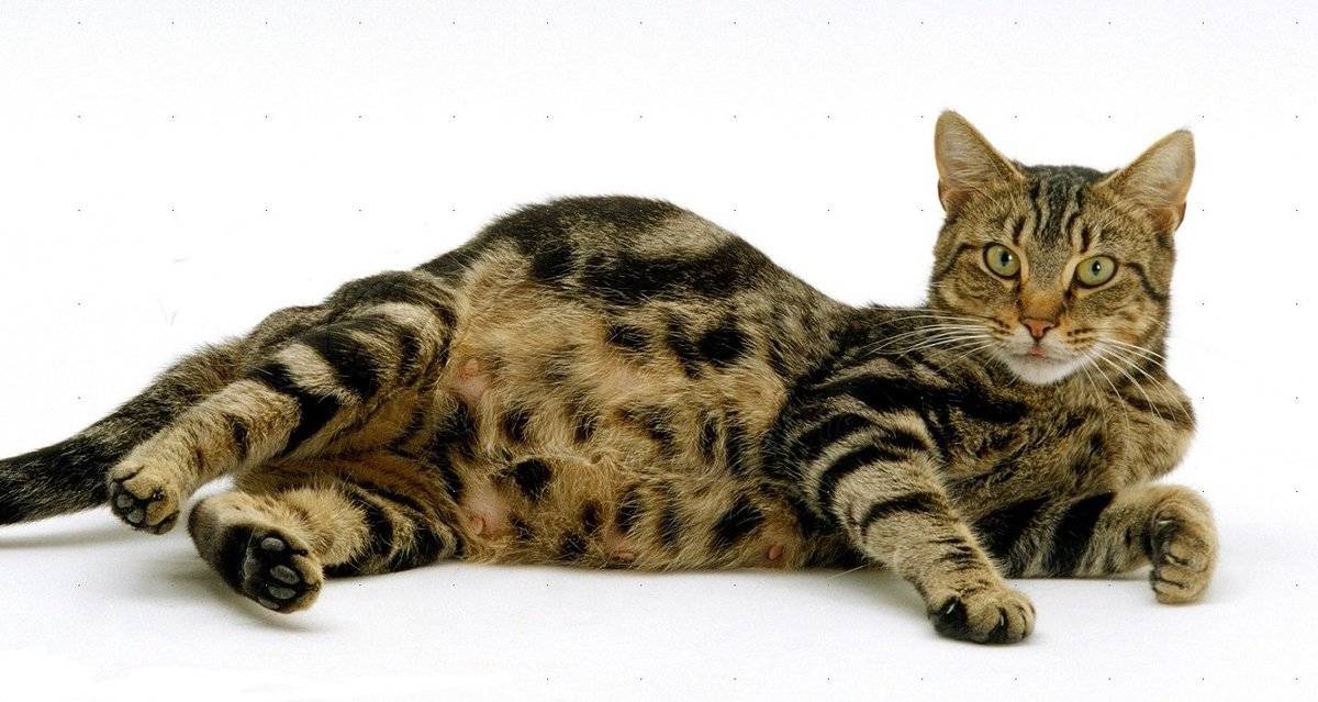 Визуально распознать беременность кошки можно лишь по изменившемуся поведению животного. Спустя месяц после оплодотворения становятся заметными бока на животе, а также набухшие соски.