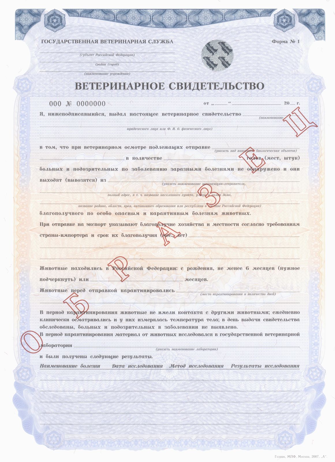 - Ветеринарное свидетельство №1. Его выдают при наличии ветеринарного паспорта в Государственной ветеринарной службе.