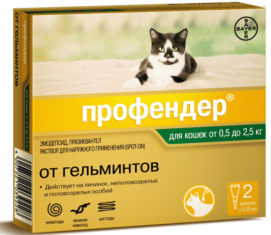 Капли от гельминтов Профендер содержат 22 мг эмодепсида и 86 мг празиквантела. Препарат наносится на такие места, откуда животное не сможет его слизать, например, на холку питомца или в область ушей. Стоимость лекарственного средства — 500 руб.