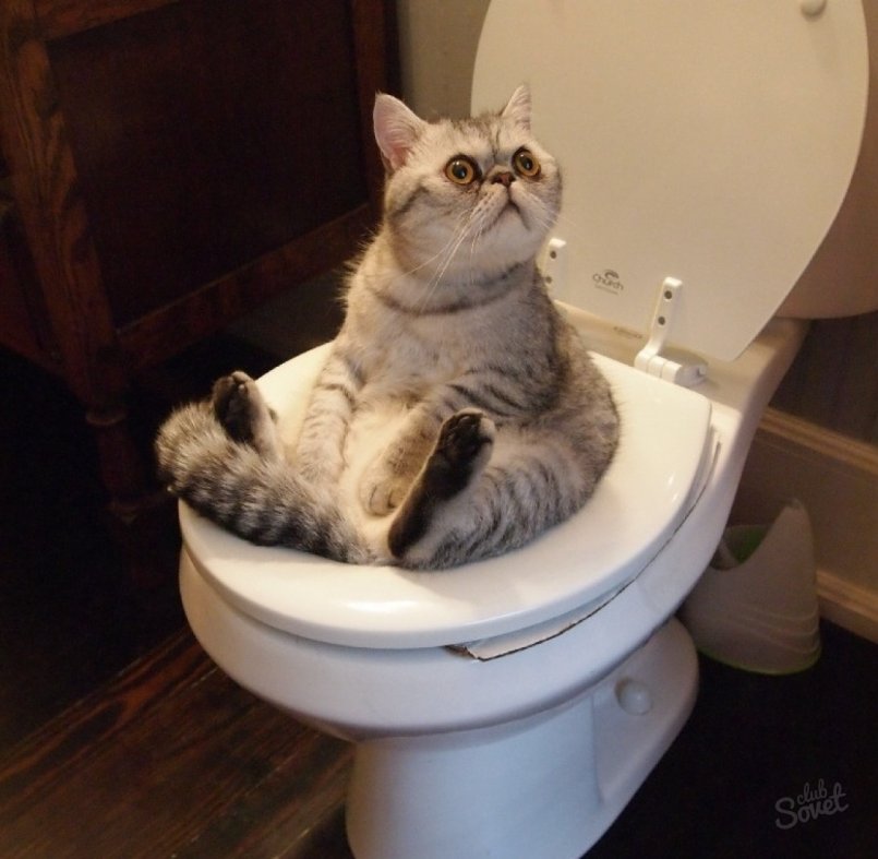 - Обучите животное справлять нужду в лоток — лучше начинать это в юном возрасте, поставив емкость рядом с унитазом.