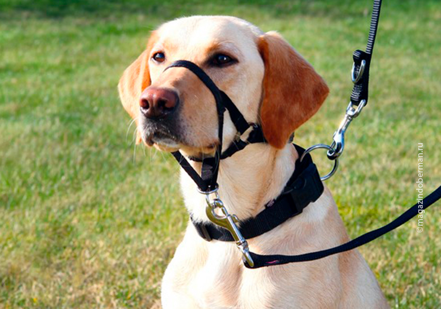 Недоуздок приспособлен к креплению на него поводка, собака, за счёт конструкции изделия, перестаёт тянуть и идёт на провисшем поводке.