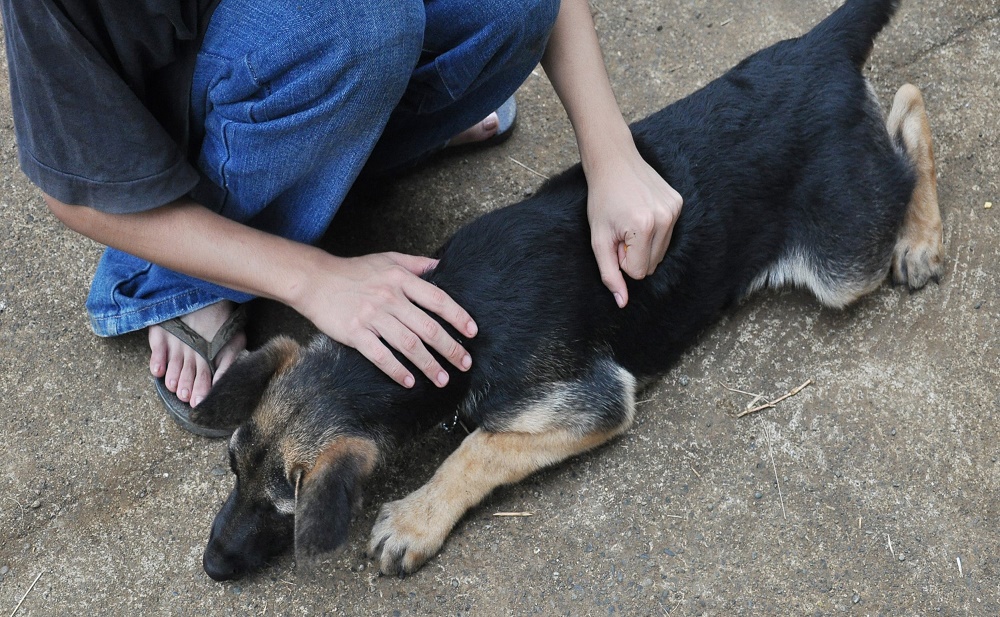 - После того как пес полностью ляжет, нажимая левой рукой на его холку (чтобы предотвратить попытки подняться), поощрить словами (например, «Хорошо») и лакомством.