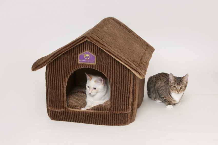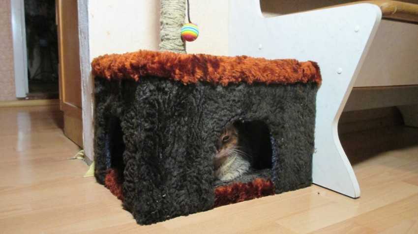 Кошкина будка – интересный, удобный вариант, подходящий для одновременного размещения двух животных. Крыша у нее делается плоской, обивается плюшем, другой мягкой тканью. Одна из сторон постройки оборудуется когтеточкой, реже – лесенкой на второй этаж. Внутрь кладется матрасик, любимая игрушка. Существуют угловые варианты, обитые искусственным мехом.