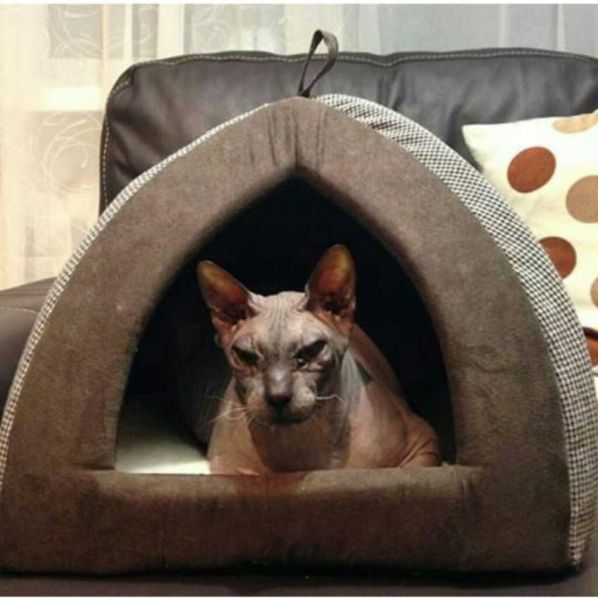 - Безопасность – в домике не должно иметься острых краев и углов, слишком мелких деталей или торчащих ниток. Нужно проследить, чтобы кот не поранил лапку и ничего не проглотил.