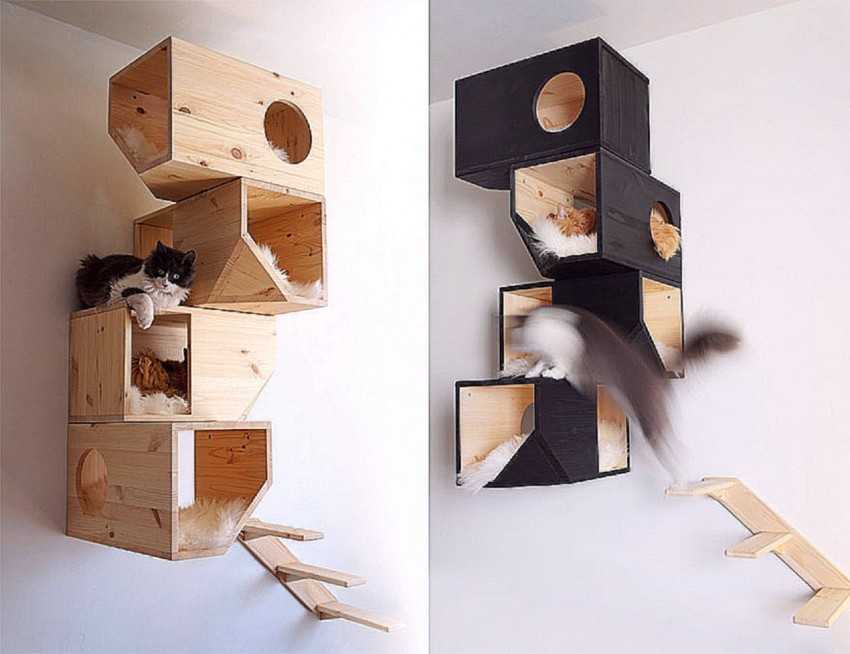 Размеры дома, обустроенного на стене, выбираем произвольные. Чтобы животное не повредило обои или покраску, на стену можно предварительно закрепить деревянный щит, а лишь затем навешивать полки.