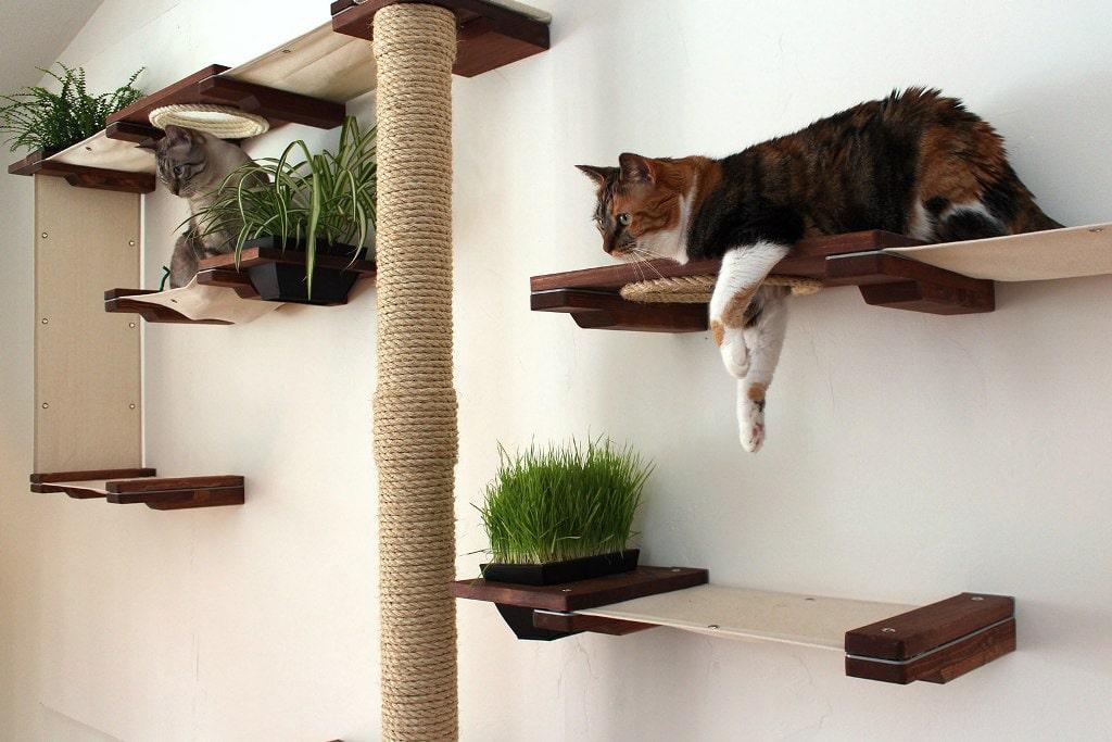 В частном доме или в квартире из нескольких ярусов, где есть лестница, можно дополнительно ничего не придумывать, так как лестница будет идеально подходить для этого. А вот в маленькой квартире потребуется соорудить что-то похожее. Конечно, можно приобрести готовые конструкции, которые часто совмещают в себе и когтеточку, и полки, и домик, но для этих целей отлично подойдет стеллаж или обычные книжные полки.