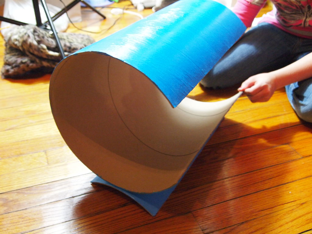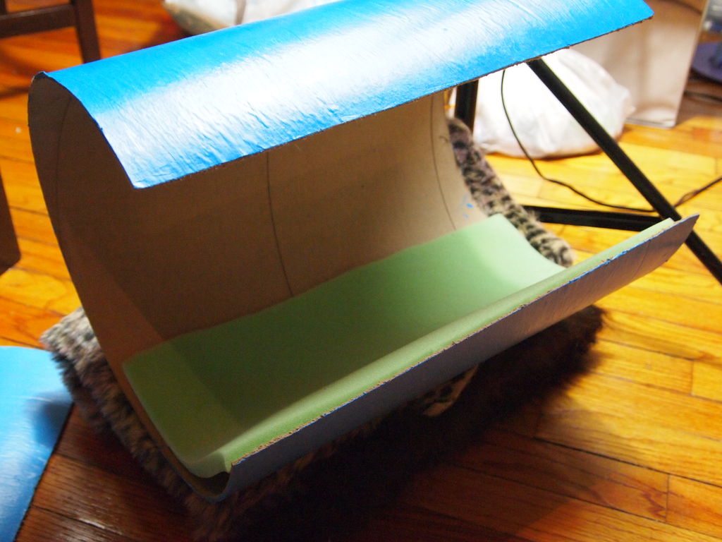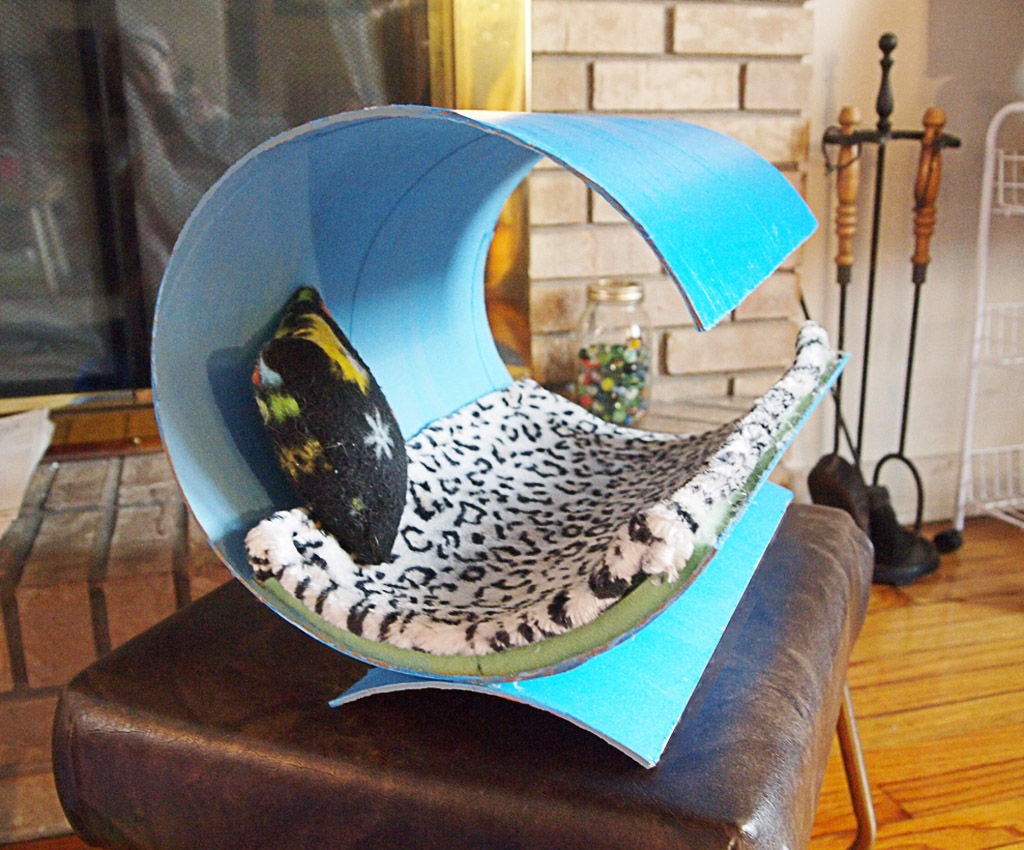 Чтобы лежак был красивым снаружи и удобным внутри, обшей пластик мягкой тканью с тонким слоем поролона или другого наполнителя. Учти, что труба гладкая и скользкая, поэтому края лучше незаметно закрепить внутри на строительный клей. Следи, чтобы наполнитель не сбивался в складки, иначе коту будет неудобно.