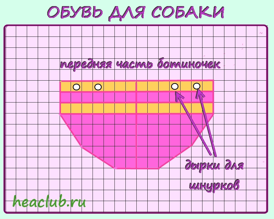 Ботиночки состоят из двух деталей, первая будет закрывать верхнюю часть лапки собаки и служить «язычком» ботинка. Вторая будет закрывать ступню, пяточку и станет боковой частью башмаков. Между собой эти две детали нужно сшить нитками. Кроме этого они будут объединяться шнурком, который затягивает обувь для собаки вверху.