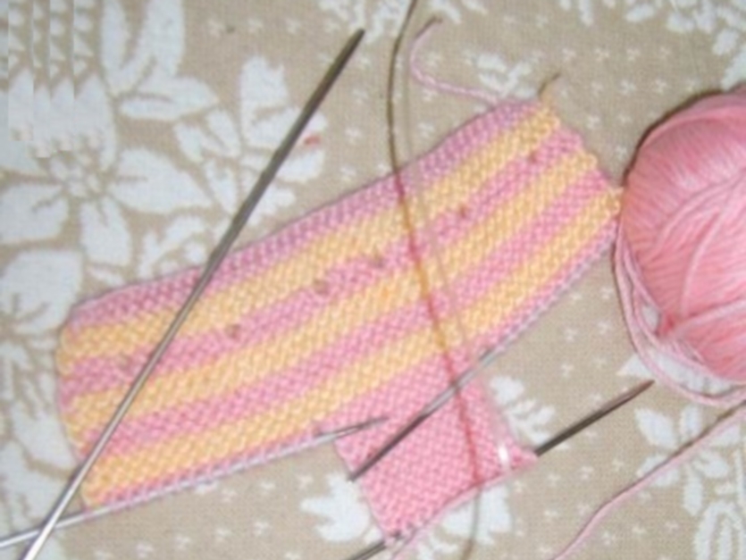 - Не забудьте про отверстия для ног – их нужно сделать примерно через 5-7 см от начального ряда. Их связать легко: на лицевом рядке свяжите 3-5 петелек резинки, закройте их, затем свяжите 3-5 петель гладью. Теперь провяжите все петли глади, кроме 3-5 последних, закройте их. Закройте петельки резинки, последние 3-5 петелек провяжите по узорчику.