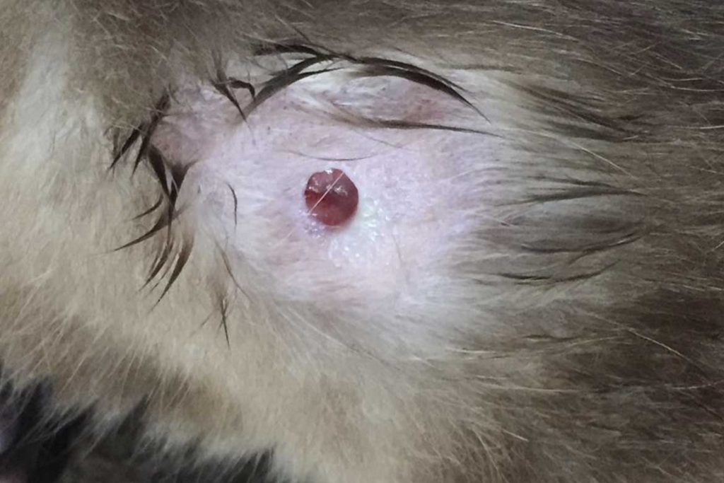 После избавления питомца от кровососущего паразита и дезинфекции ранки следует еще раз внимательно осмотреть кожу животного в месте укуса. Как правило, оторванная голова клеща заметна в виде черной точки на красном фоне.