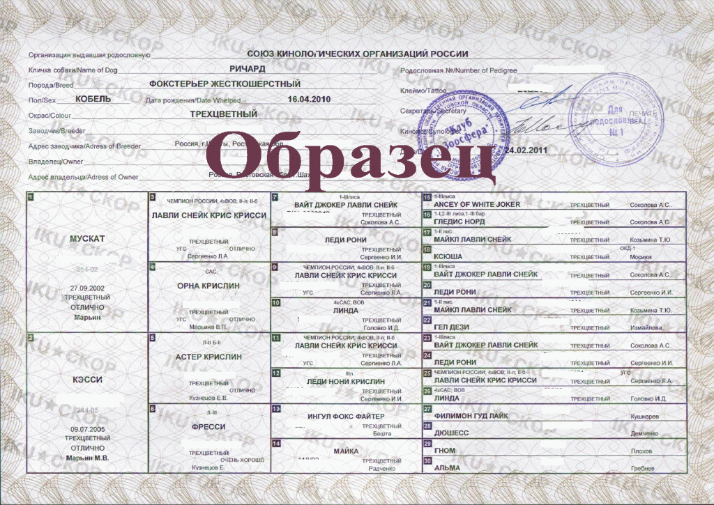 — Для получении первичной родословной (свидетельство о происхождении) владелец собаки сдает в любую Федерацию РКФ три специальных бланка с описанием и 2 фотографии с подписью судьи и его данными.