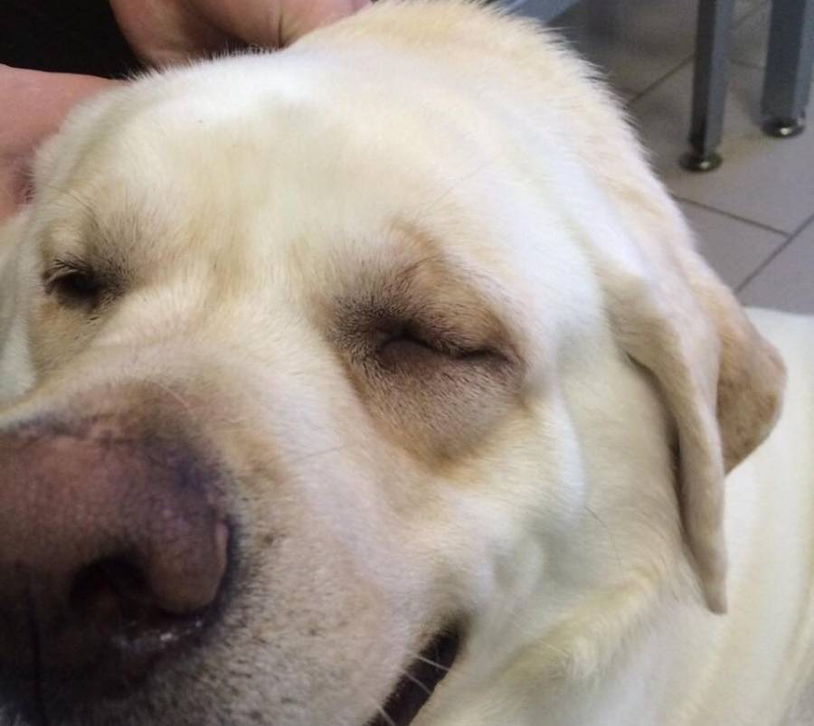 Одностороннее или двустороннее воспаление век в результате повреждения или местной инфекции. Иногда причиной может стать пищевая аллергия. Веки собаки отекают, становятся красного цвета, зудят, образуются чешуйки, язвочки, выпадают ресницы.