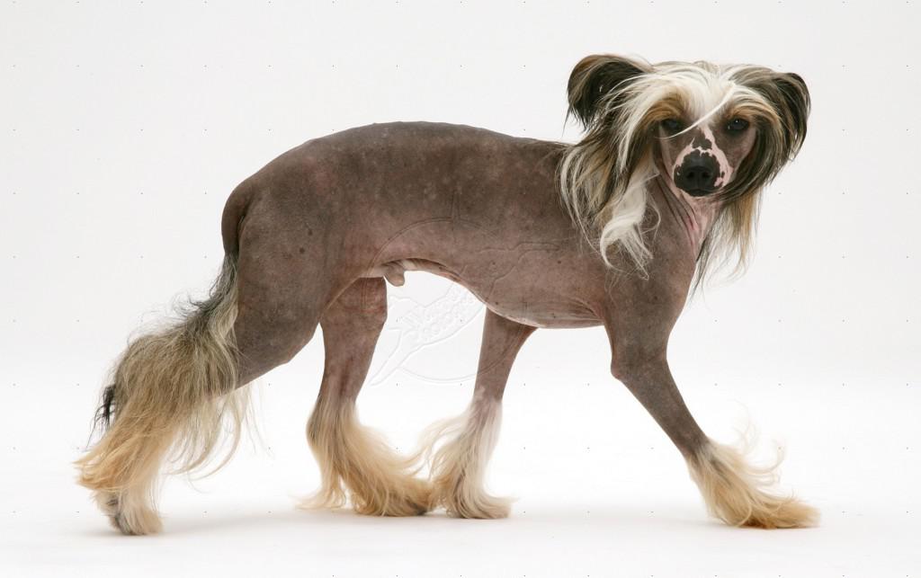 Два представителя породы приковывают внимание. Собака с практически голой кожей, большими ушами, пушистой гривой, напоминающая конька со статью оленя, и пуховая китайская, сплошь покрытая мягкой длинной шерстью, коренастая, крепкая с более тяжеловесным костяком